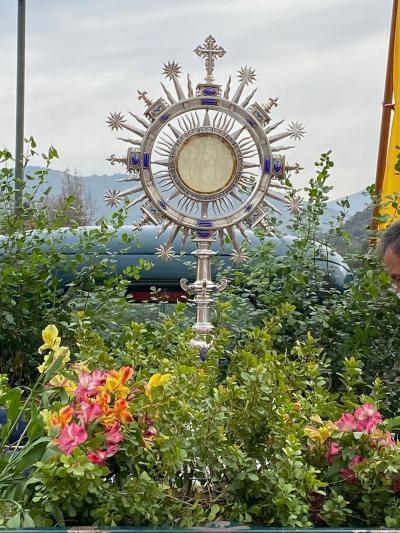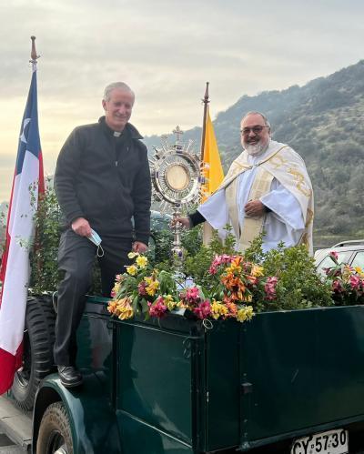 Los festejos de Corpus Christi partieron el jueves con una Vigilia de Adoración Nocturna en nuestra parroquia. El viernes la custodia de nuestra capilla con el Señor Sacramentado fue llevada a la Parroquia Sta Teresita donde estuvo hasta el sábado en la mañana. Desde ahí se trasladó a la Parroquia Sta Rosa de Lo Barnechea donde permaneció hasta el domingo para posteriormente ser llevada a la Iglesia Sagrada Familia (Las Pataguas). A las 16 horas, en una procesión con nuestro párroco, Rodrigo Domínguez y el padre Ignacio Cortés de Las Pataguas, más fieles, el Señor Sacramentado fue llevado de vuelta a la capilla de Adoración de María Madre de Misericordia.